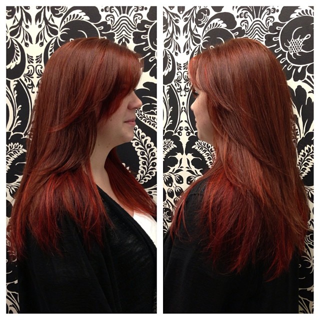 Andrea created a warm fall effect on Lindsey with natural copper red as a base color and red and peak-a-boo panels underneath. #fawnandfoxsalon #copper #holidayhair #fallcolor