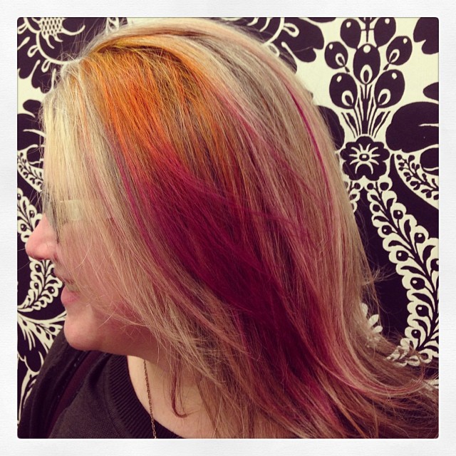 Kristin created an orange to fuchsia tie-dyed effect through a section of Jan’s hair. #fawnandfoxsalon #tiedye #thedraudt