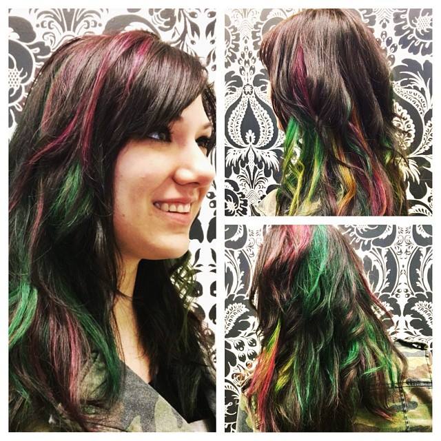 Andrea created a natural black base with flashes of greens and ribbons of magenta on Chelsea. @yanya_ #fawnandfoxsalon