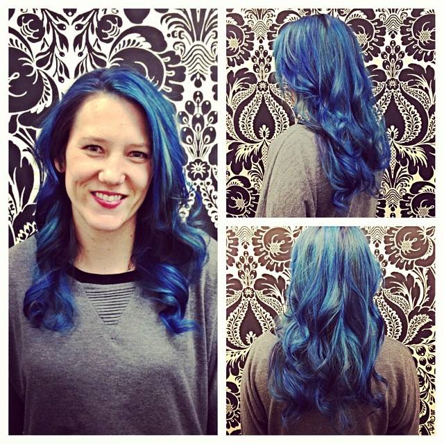Kristin layered multiple shades of blue to create this icy palette on Heather. #fawnandfoxsalon #thedraudt